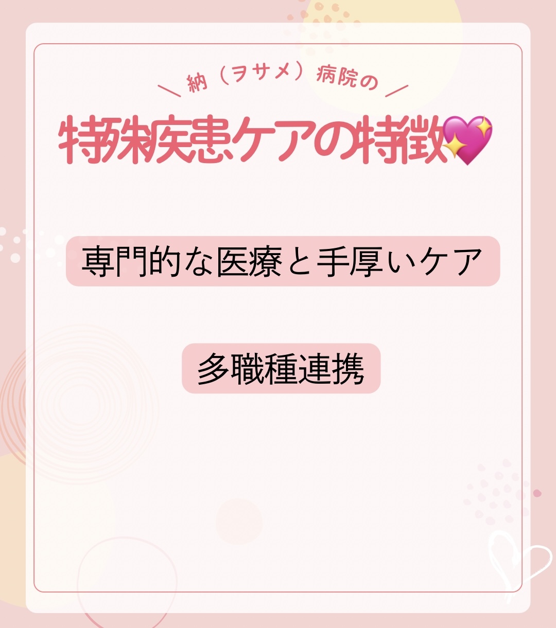 当院の特殊疾患病棟は、長く療養が必要な方や、特別な医療ケアが必要な方のための病棟です。患者さま一人ひとりの体調や生活に合わせたサポートを大切にしています。